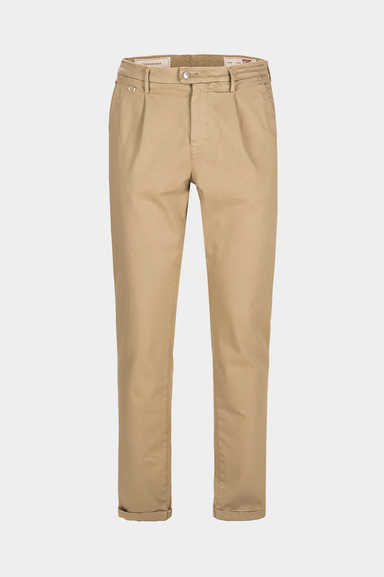 Contemporary chino fit with pleats, soft on the hips and legs, tapered at the bottom.