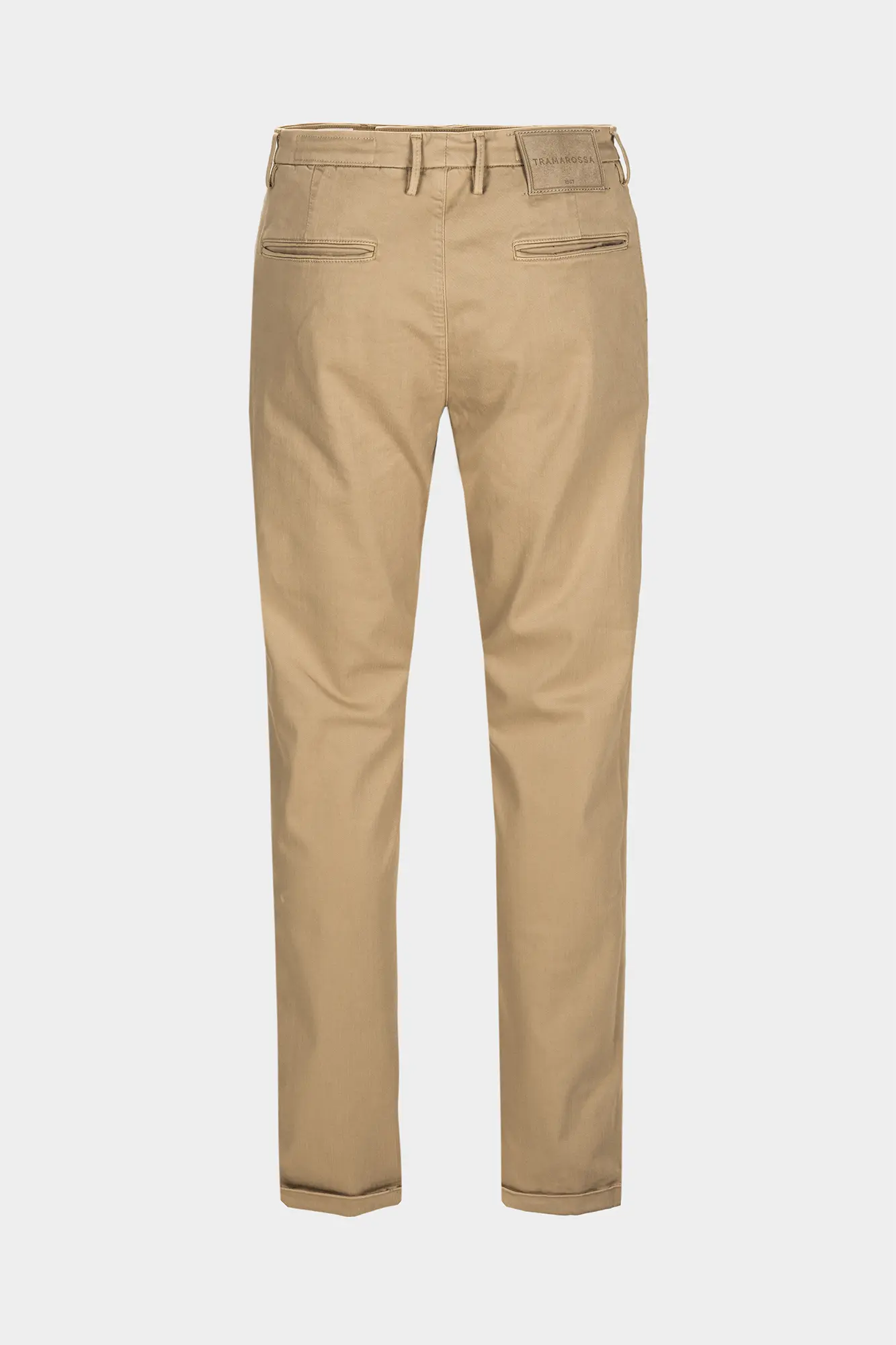 Refined suede back label in a tone-on-tone color with the garment, hot-stamped with the Tramarossa logo.