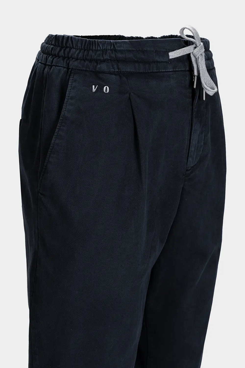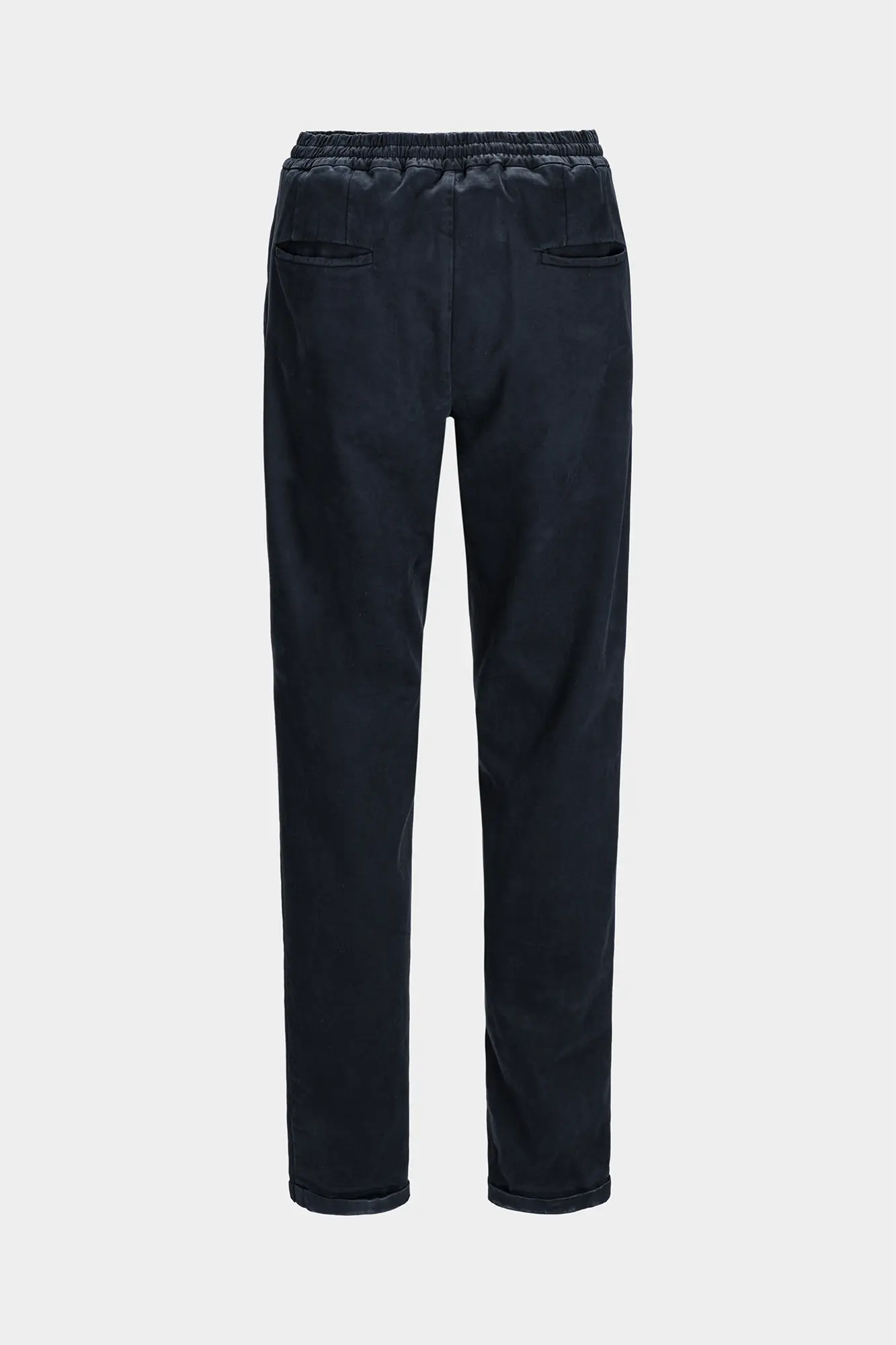 Leisure-fit trousers, a model that combines comfort and tailoring. The casual style is emphasized by the drawstring waist, while the slash pockets and pleats give the garment an elegant balance, and the leg maintains a slim line.