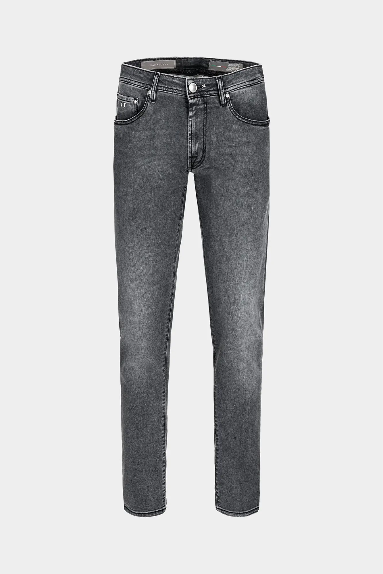 - Matt nickel-finish button with knurled surface and embossed Tramarossa logo.