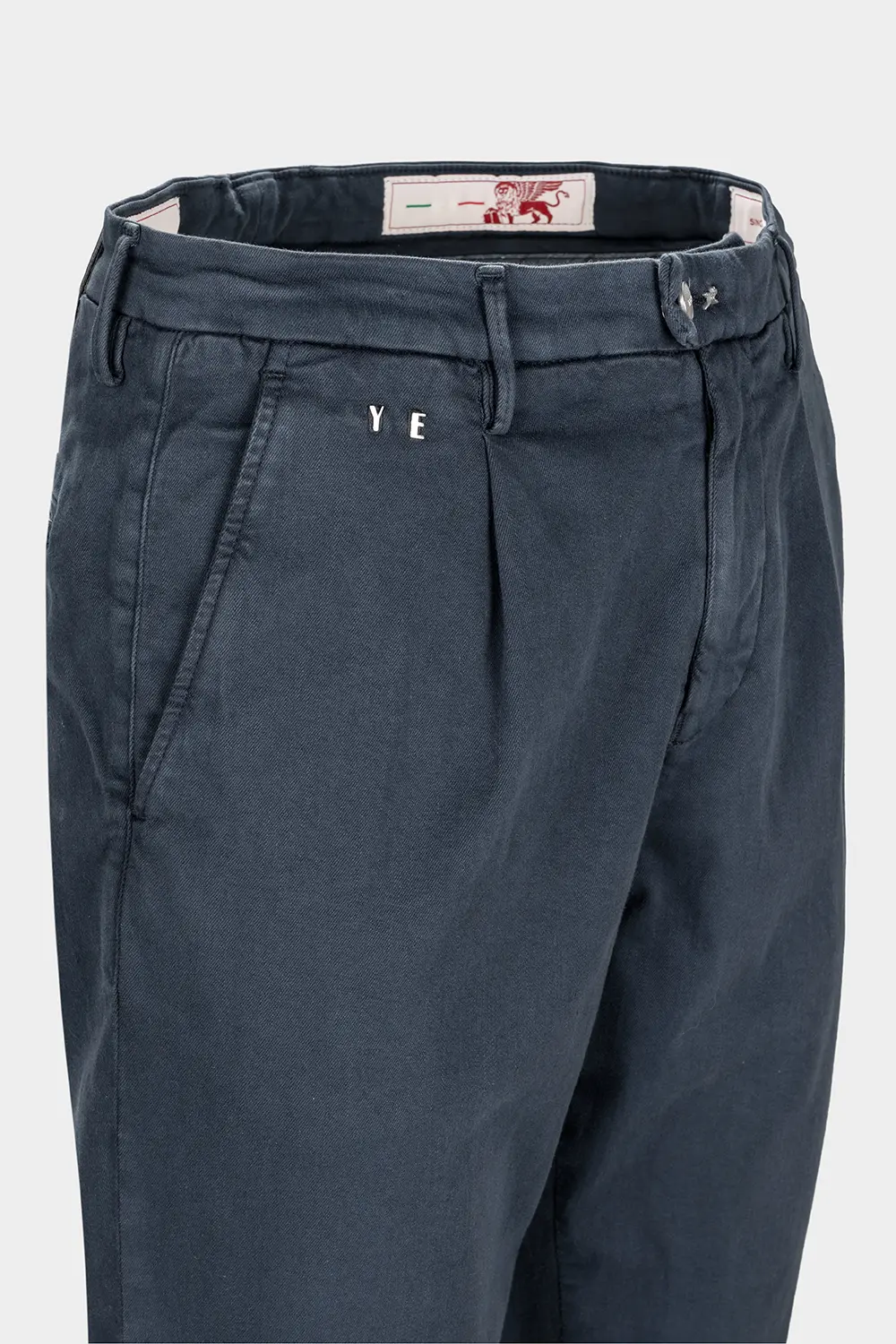 Contemporary chino fit with pleats, soft on the hips and legs, tapered at the bottom.