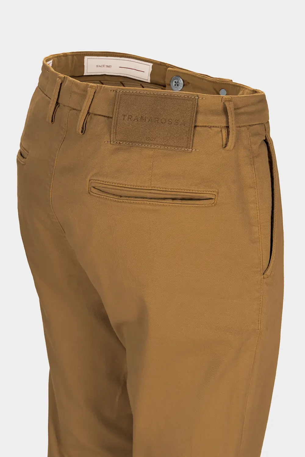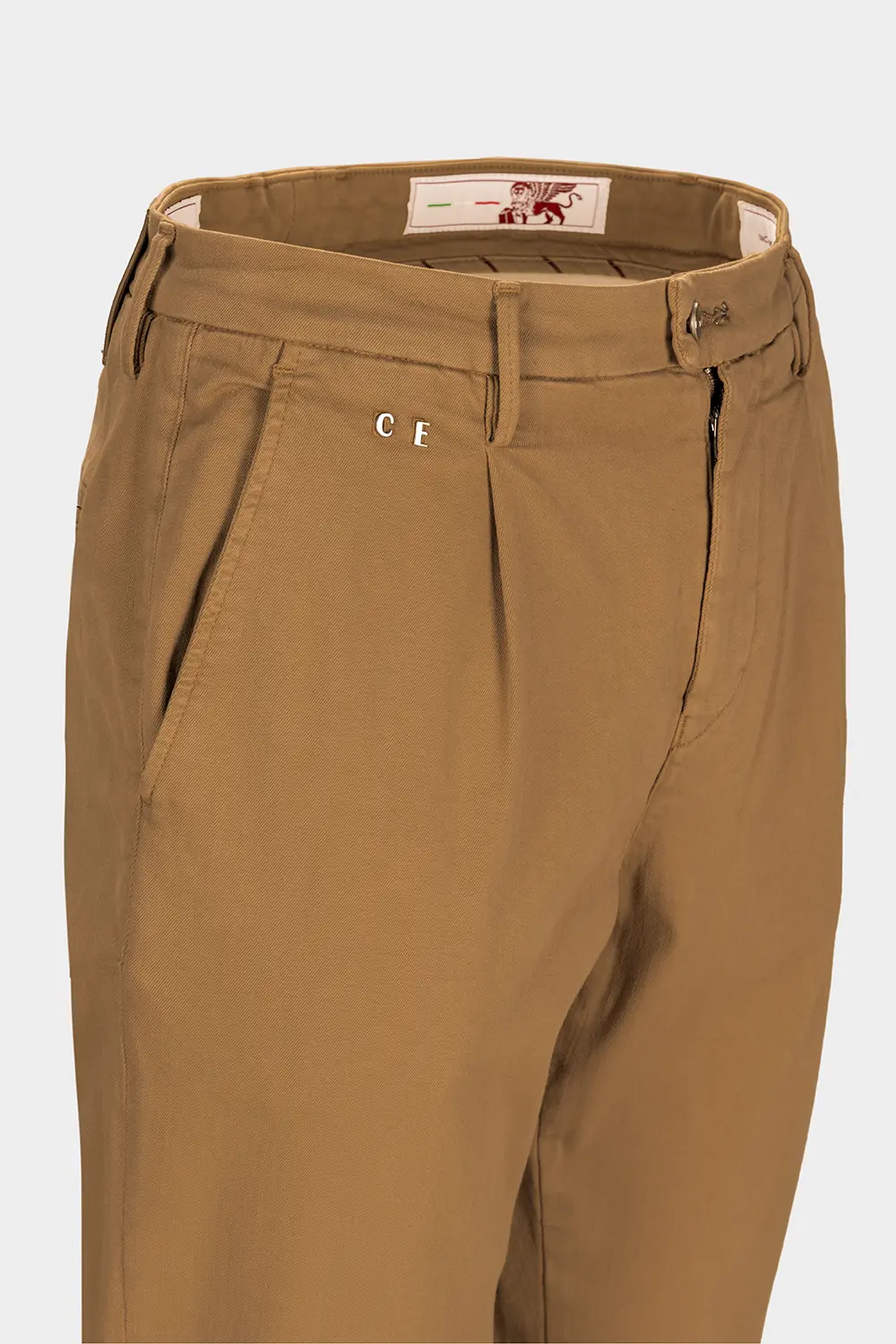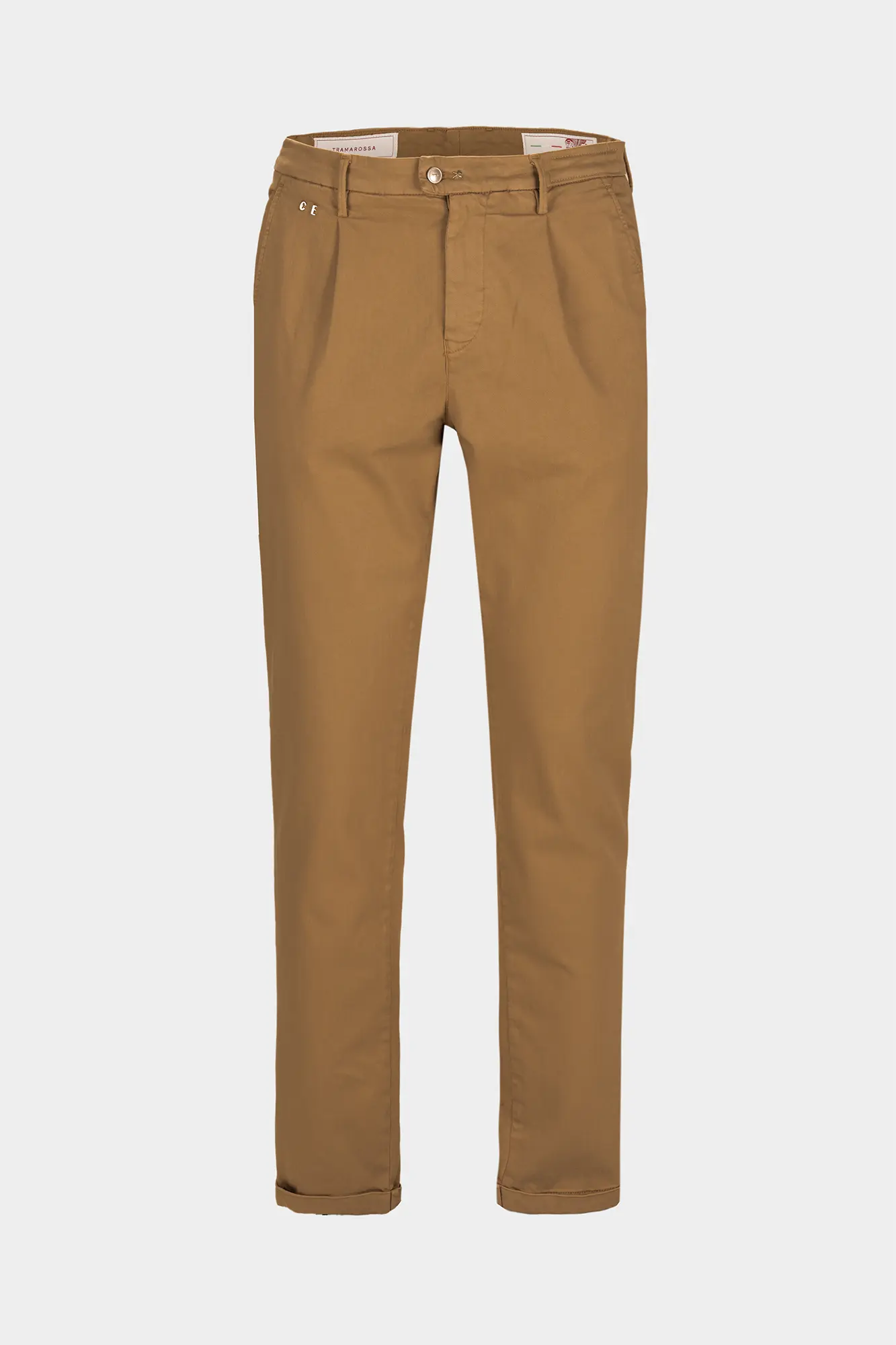 Contemporary chino fit with pleats, soft on the hips and legs, tapered at the bottom.