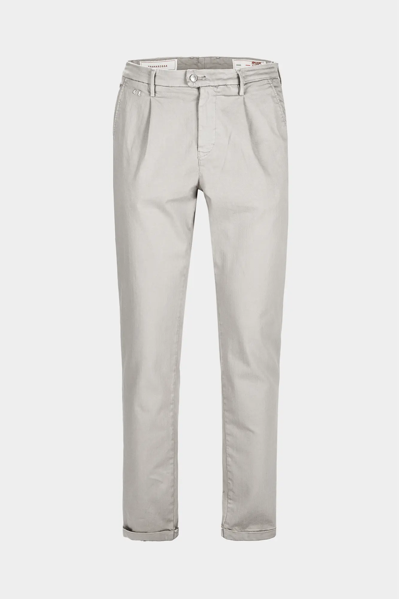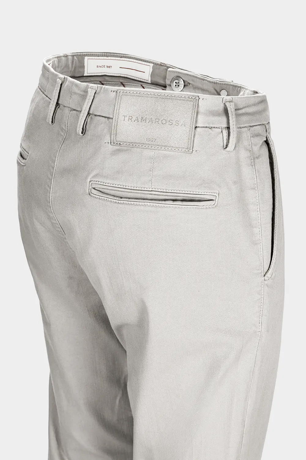Refined suede back label in a tone-on-tone color with the garment, hot-stamped with the Tramarossa logo.