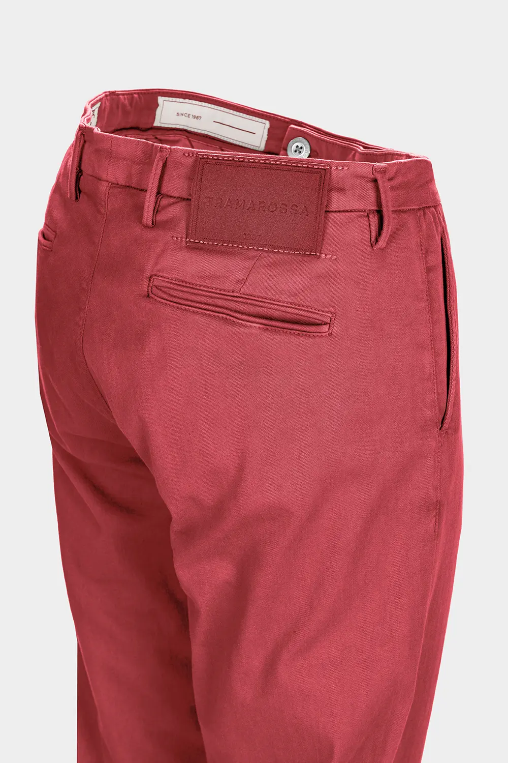 The Luis model is the most formal expression of Tramarossa trousers. The fit is an interpretation of the chino fit. This garment features a slash pocket on the front and a welt pocket on the back. It is fitted along the entire leg and tapered at the bottom. The bottom features a sewn cuff.