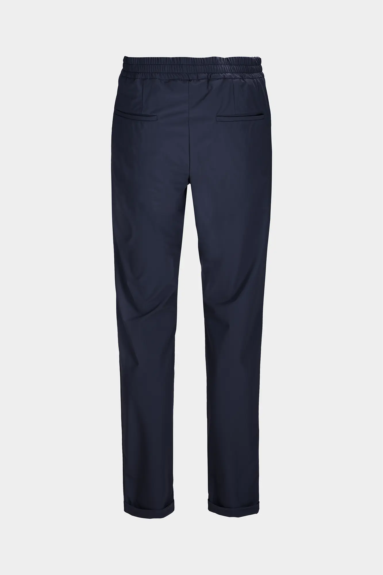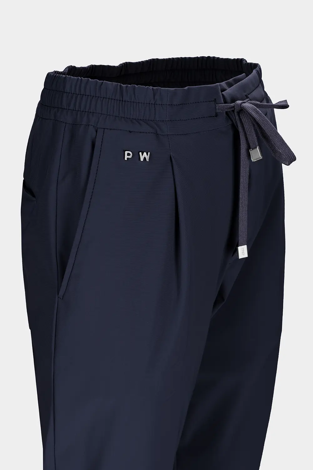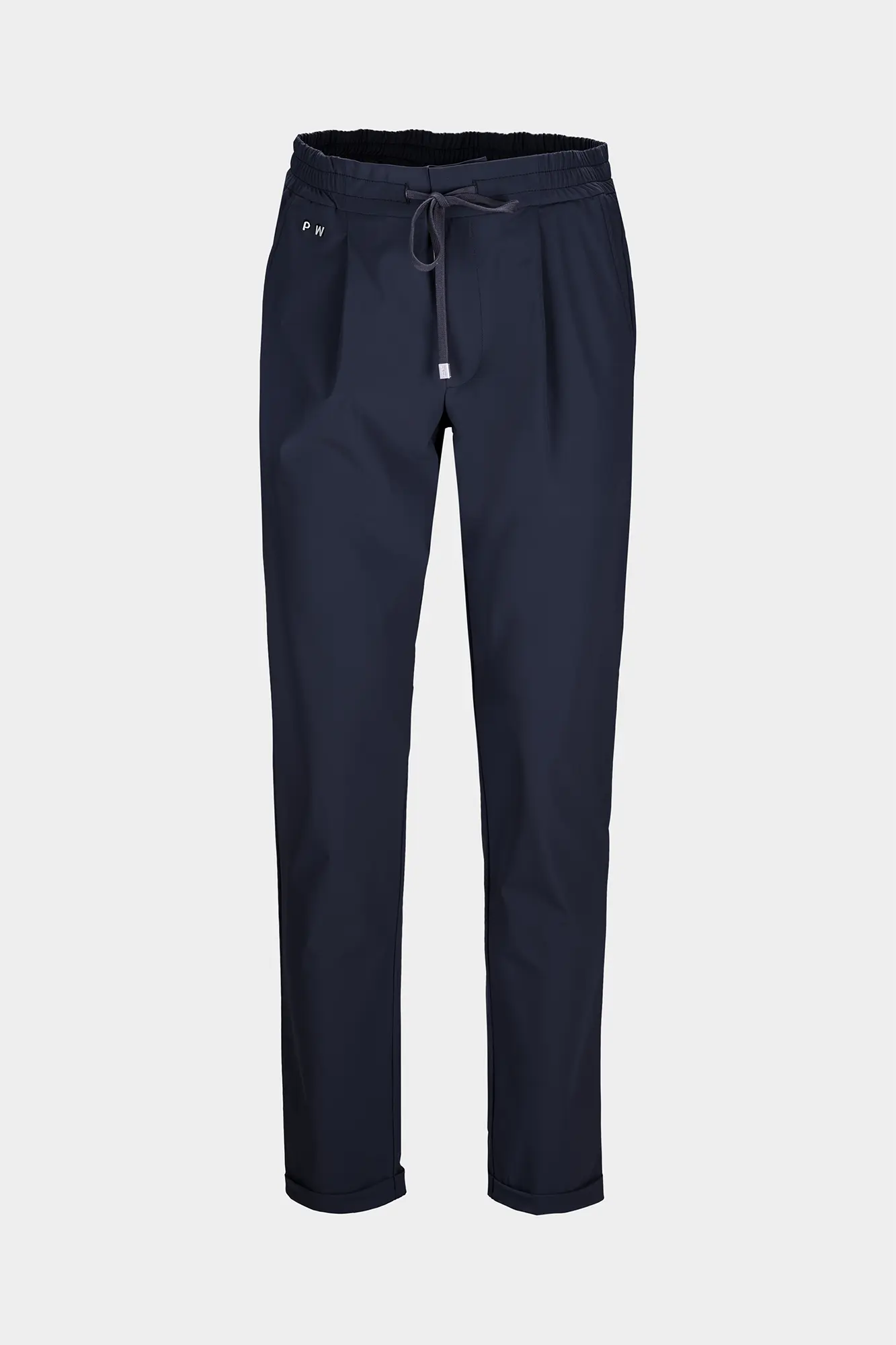Leisure-fit trousers, a model that combines comfort and tailoring. The casual style is emphasized by the drawstring waist, while the slash pockets and pleats give the garment an elegant balance, and the leg maintains a slim line.
