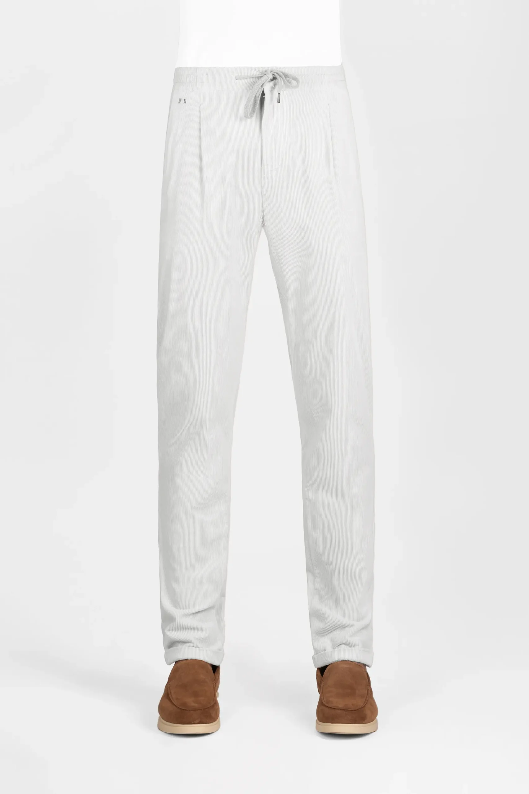 Pantalone dalla vestibilità leisure, un modello che unisce comfort e sartorialità. Lo stile casual è sottolineato dalla coulisse in vita, la tasca taglio america e la pince donano un’elegante equilibrio al capo, la gamba mantiene una linea asciutta.
