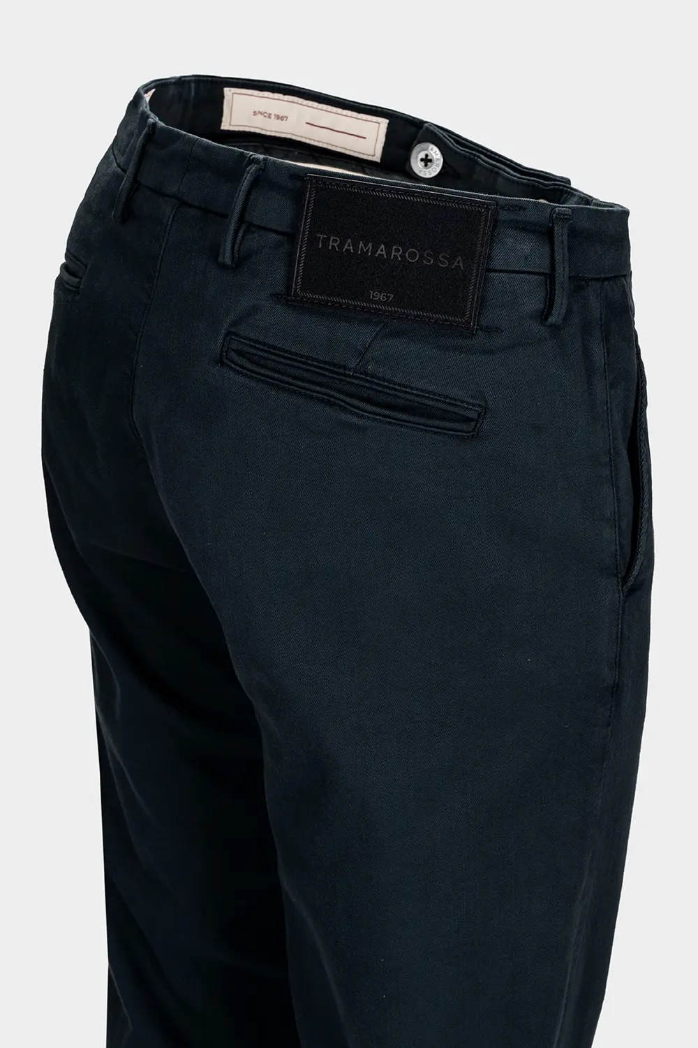Etichetta posteriore in raffinato suede, in una colorazione tono su tono con il capo, stampata a caldo con logo Tramarossa.